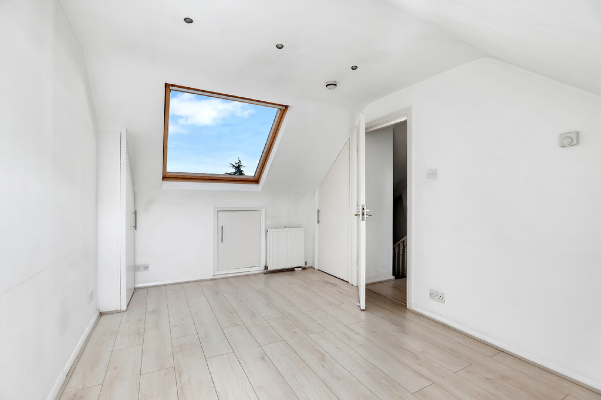 The entrance leads to a staircase up to the second floor, opening into a hallway with built-in storage cupboards. The reception room offers space for living and dining areas, enhanced by two skylight windows and light wood-effect flooring. The kitchen is fitted with wall and base units, worktops, and a skylight window, including an integrated electric oven with a hob and space for appliances.